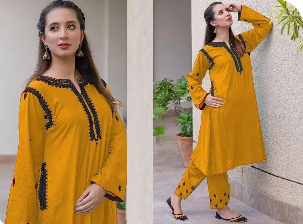 2 Pcs Women's Stitched Linen Embroidered Shirt And Trouser